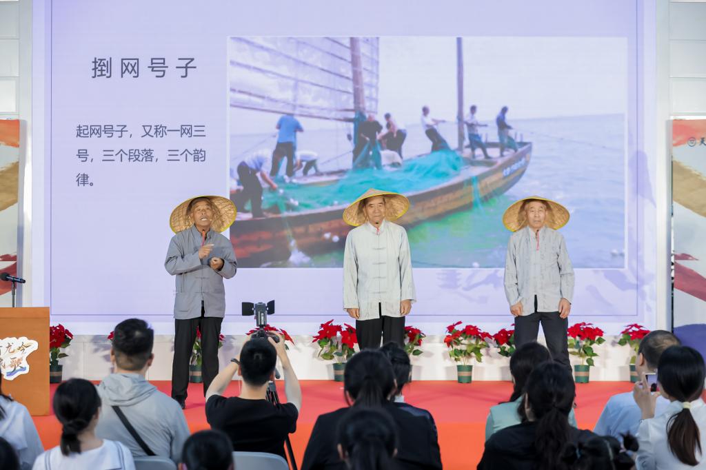 活動(dòng)現(xiàn)場(chǎng),漢沽80歲的漁民趙加岺,攜劉翠祥、劉翠波兄弟帶來《捯網(wǎng)號(hào)子》。粗獷原始的號(hào)子聲,如同一陣陣?yán)顺保路饘⒙牨妿Щ氐讲龥坝康碾U(xiǎn)境之中,讓人感受到漁民們?cè)诖蠛I蟿谧鲿r(shí)的艱辛與豪邁,也展現(xiàn)出天津沿海地區(qū)質(zhì)樸的生活風(fēng)貌。