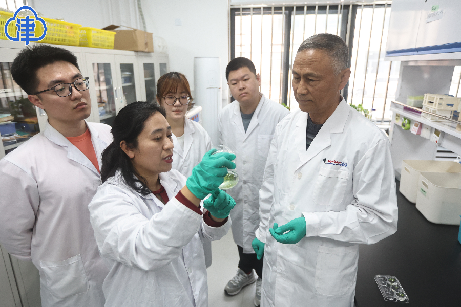 孫金生研究員(前右)、楊琳教授(前左)與學(xué)生討論抗菌肽浮萍實(shí)驗(yàn),細(xì)化中試方案