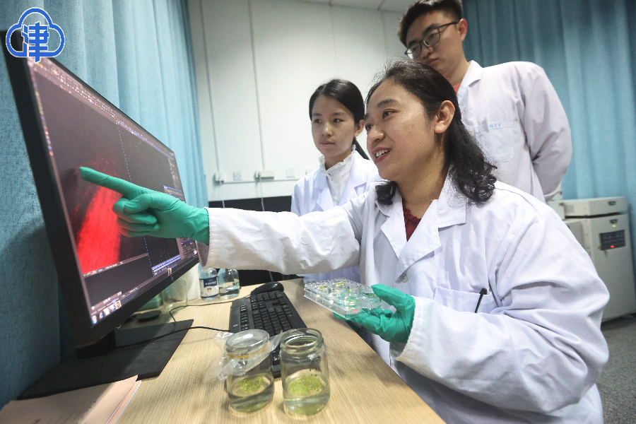 楊琳教授(前)帶領(lǐng)學(xué)生,用共聚焦顯微鏡觀察浮萍吸附鎘后發(fā)生的信號響應(yīng),以分析浮萍耐鎘的信號機(jī)制