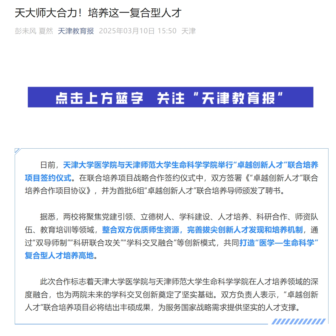此次合作標志著天津大學醫學院與天津師范大學生命科學學院在人才培養領域的深度融合,也為兩院未來的學科交叉創新奠定了堅實基礎。雙方負責人表示,“卓越創新人才”聯合培養項目必將結出豐碩成果,為服務國家戰略需求提供堅實的人才支撐。