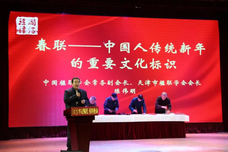 此外,中國楹聯學會常務副會長、天津市楹聯學會會長陳偉明在宣講的同時,還與天津市楹聯學會聯墨家彭英科、王軍、蘇玉作、臧志建一起現場揮毫潑墨,為市民代表贈送福字,共迎新春。