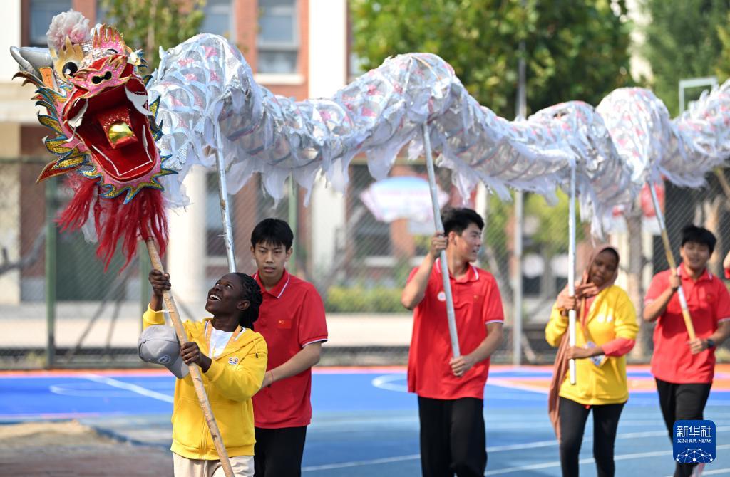 10月25日,“漢語橋”選手在天津霍元甲學校的操場上學習舞龍。