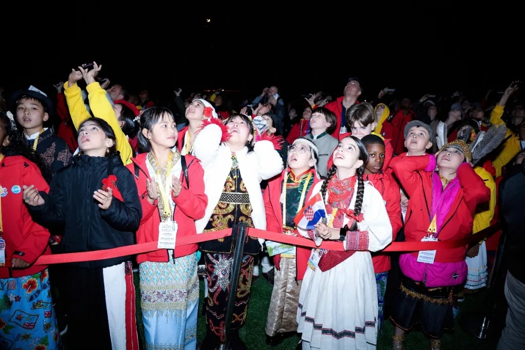 儀式上,各國小選手們拿起手中的拼圖,合力拼出象征著團(tuán)結(jié)與夢想的“漢語橋”logo,正式啟動本屆“漢語橋”世界小學(xué)生中文秀。隨后,選手代表與天師大師生共同觀看了漢語橋歡迎儀式無人機(jī)燈光秀,寓意著“放飛夢想,點亮未來”。