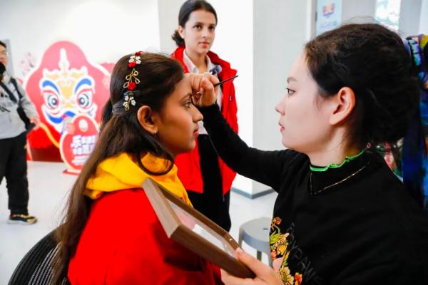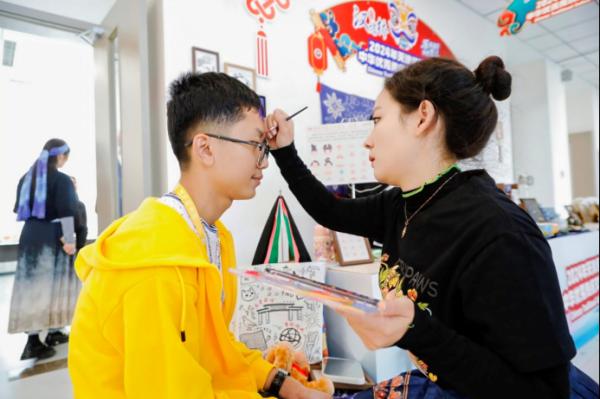 花鈿展位前,選手們認真挑選自己喜愛的圖案,由專業老師描繪在臉上,其中還有不少男生前來嘗試畫花鈿。來自尼泊爾的蘇羽說:“我對花鈿特別感興趣,尼泊爾同樣重視女性妝容,我會將這次特別的體驗分享給朋友們。”