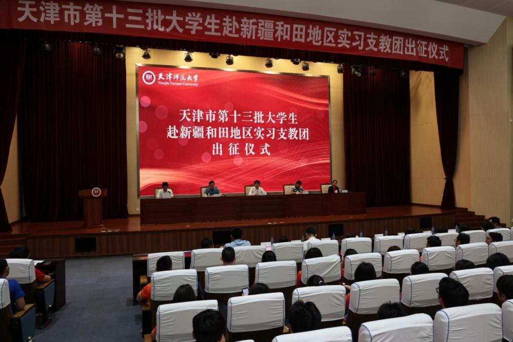 天津市第十三批大學生赴新疆和田實習支教團出征儀式近日在天津師范大學舉行,來自天津師范大學、天津醫科大學、天津中醫藥大學、天津理工大學、天津財經大學、天津外國語大學、天津商業大學、天津職業技術師范大學、天津城建大學、天津體育學院的370余名援疆支教大學生及帶隊管理教師等參加。