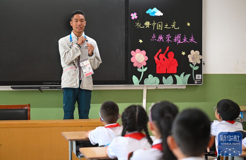 ↑9月1日,在天津市和平區(qū)萬全小學(xué),來自天津師范大學(xué)的巴黎奧運(yùn)會(huì)志愿者陳文棟為學(xué)生們講述志愿服務(wù)故事。
