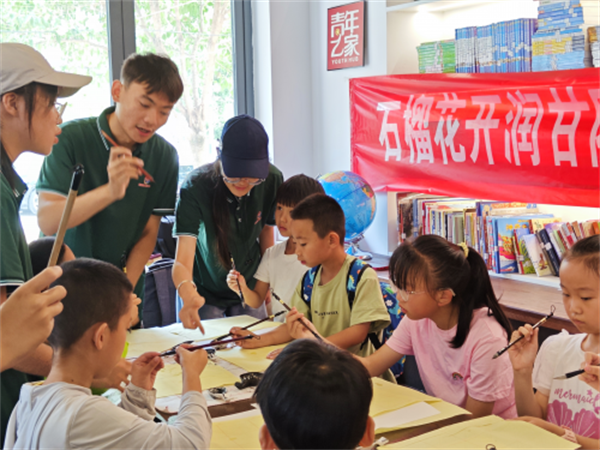 (圖為實踐隊成員教授托管班的孩子們學習漢字書法)