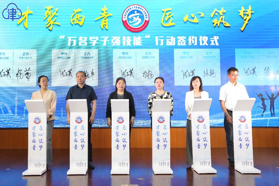啟動儀式上進行了集中簽約儀式,西青人社局分別與天津工業大學、天津師范大學、天津理工大學、天津城建大學、天津農學院簽訂“萬名學子強技能”行動合作協議。天津交通職業學院、天津鐵道職業技術學院、天津市勞動經濟學校分別與天津宜科自動化股份有限公司、通號工程局集團天津裝備技術有限公司、天津瑞馳興模具有限公司簽訂了汽車及高端裝備制造產業鏈校企合作協議。