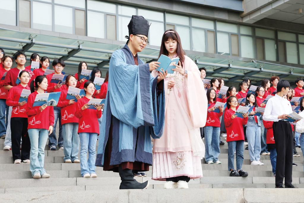 世界讀書日當天,天津師范大學圖書館舉辦集體朗誦快閃活動,旨在倡導閱讀文化,做好閱讀推廣,激發學生閱讀興趣。該活動以“品味津韻 讀享未來”為主題,以集體朗誦為主要內容,由130名學生領誦,面向全校招募500名學生參加集體朗誦。