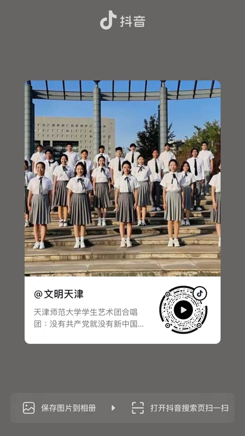 您也可以下載抖音APP,關(guān)注“文明天津”抖音號,保存下方二維碼圖片,打開抖音APP觀看參賽團(tuán)隊演唱作品。