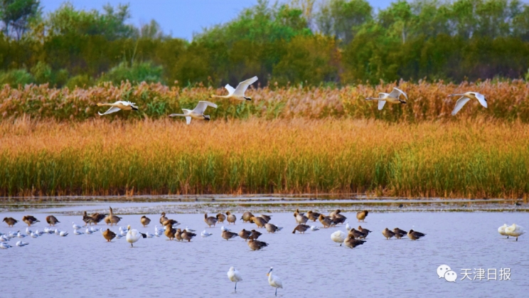 “看,麋鹿來啦!”說話間,遠處蘆葦蕩出現了一群膘肥體壯的“四不像”。“一共有9頭麋鹿,這是一個小群落。長著鹿角的是成年雄鹿。”站在葦塘邊,趙大鵬介紹,“七里海濕地是麋鹿的天然食堂,良好的生態環境帶來豐富的食材。研究麋鹿的食性和食譜對于保護這個物種至關重要。據七里海濕地自然保護區工作人員觀測,目前的麋鹿種群已達到31頭?!?strong>七里海濕地是“東亞—澳大利西亞遷飛區”候鳥遷徙路線的重要停歇地。生態環境好不好,鳥兒會用翅膀來“投票”。據七里海濕地自然保護區工作人員觀測,當日已經有上萬只候鳥飛臨七里海濕地,其中,東方白鸛、天鵝、白琵鷺等珍稀鳥類超過2000只。