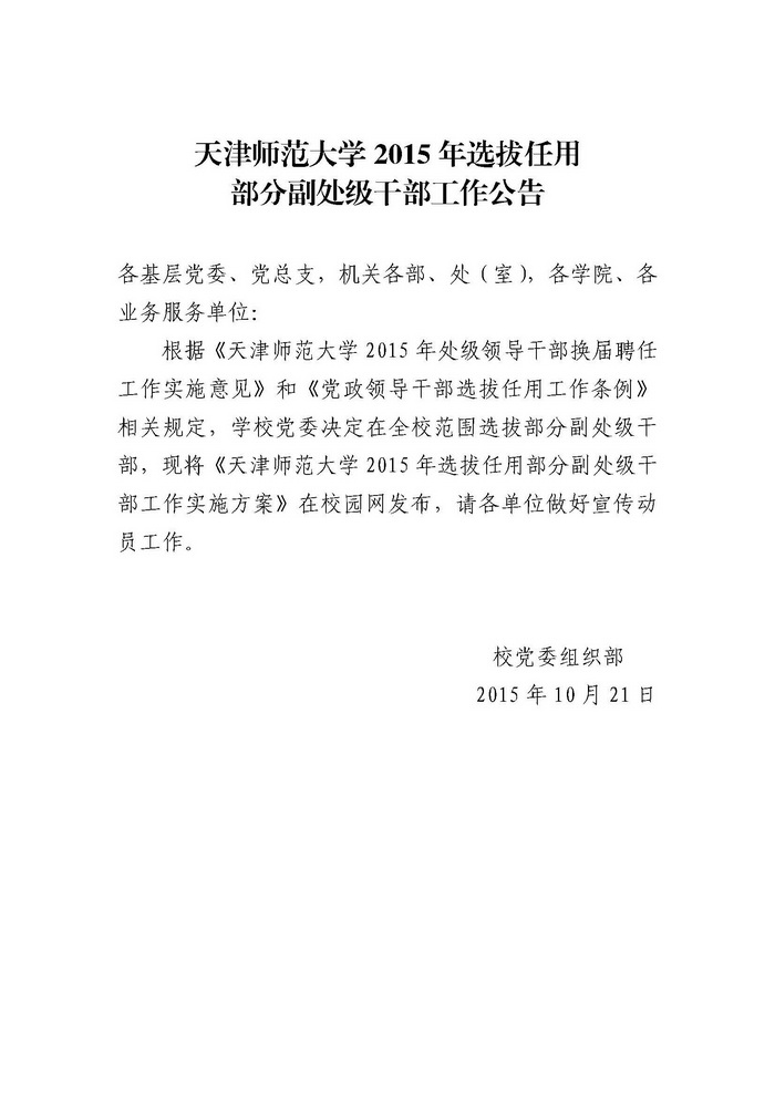 天津師范大學2015年選拔任用部分副處級干工作公告