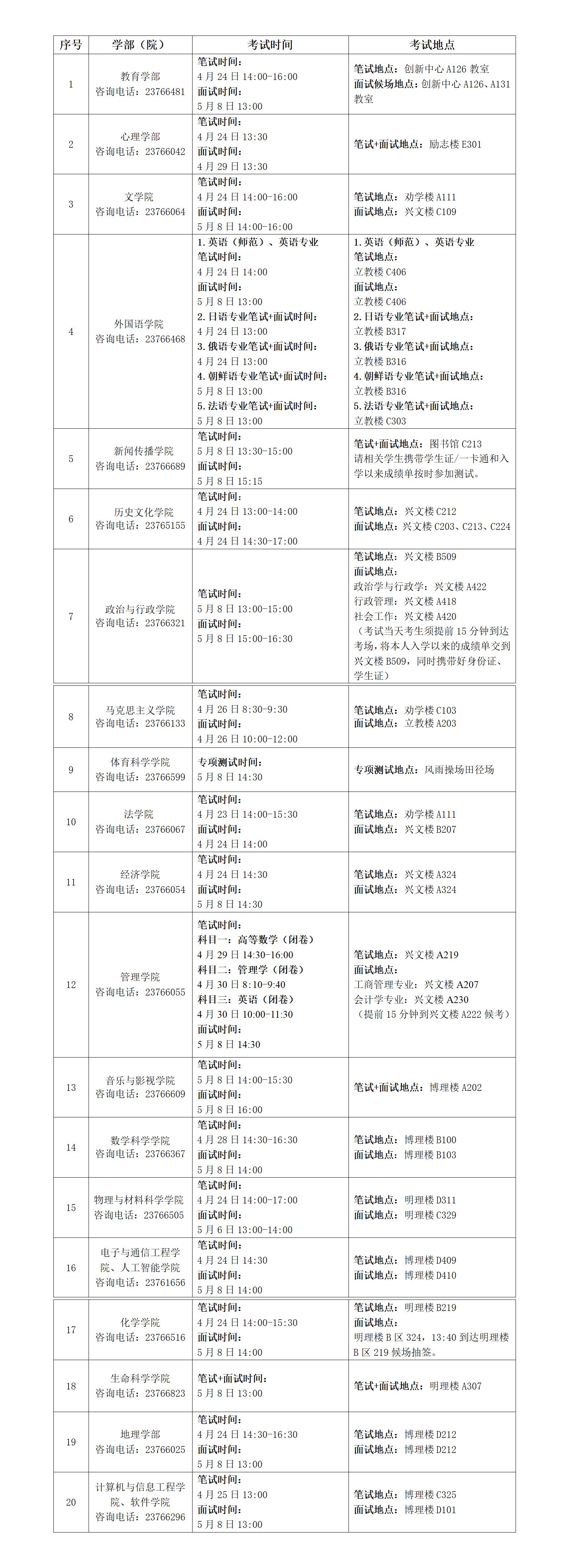 請申請轉專業的學生提前做好準備,按時參加專業測試,缺考者視為自動放棄申請轉專業。各接收轉專業學部(院)的專業測試安排如下: