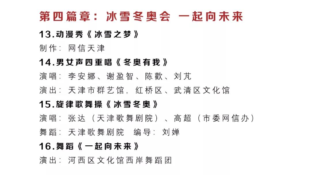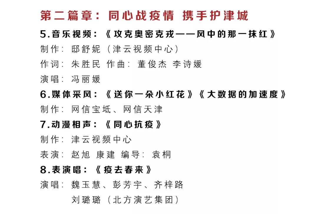 天津市網絡春晚自2018年開始已連續舉辦五年,是網信戰線的一場文化盛會。今年的晚會由《寅虎迎新春,網絡中國節》《同心戰疫情,攜手護津城》《奮楫正當時,發展看今朝》《冰雪冬奧會,一起向未來》《喜迎二十大,啟航新征程》五個篇章組成。除少數專業院團演員參演外,大部分節目由網信系統的機關干部、媒體編輯、高校師生、互聯網企業員工和好網民志愿者演出。