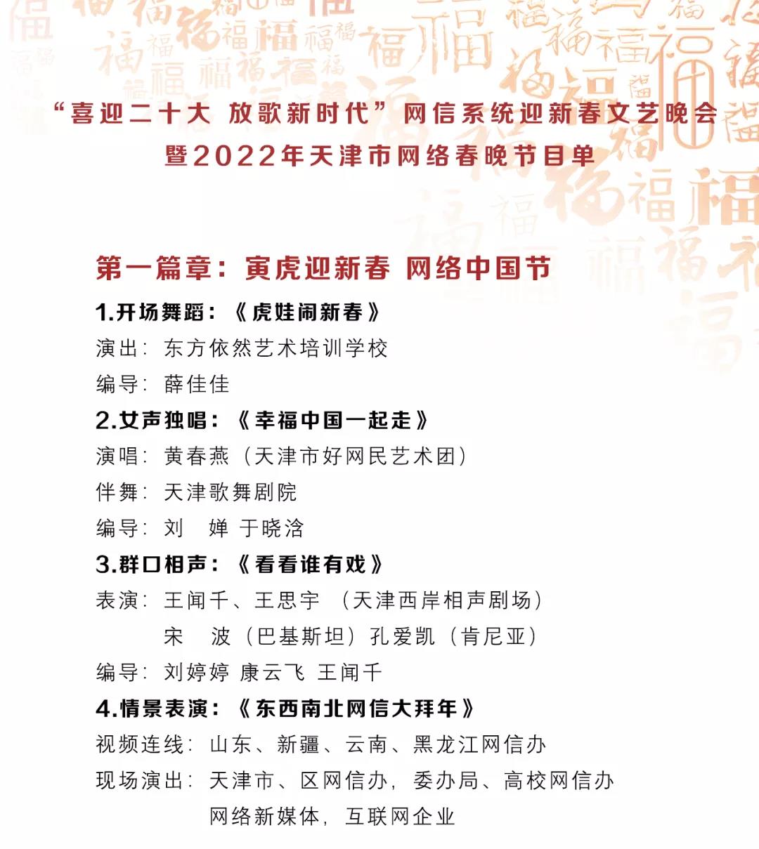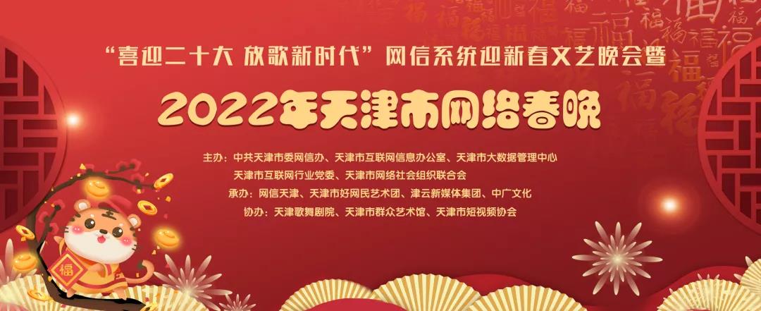 今天是農歷除夕,由天津市委網信辦、天津市互聯網信息辦公室、天津市大數據管理中心、天津市互聯網行業黨委、天津市網絡社會組織聯合會共同主辦的“喜迎二十大 放歌新時代”2022天津市網絡春晚暨網信系統迎新春文藝晚會于今晚隆重推出,向廣大網友和觀眾朋友們祝賀新春。