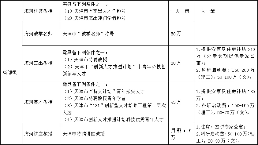 3.每年在津工作累計6個月及以上的頂尖人才,給予一次性1000萬元科研經費資助和200萬元生活獎勵資助;每年在津工作累計2個月及以上且不滿6個月的,給予一次性500萬元科研經費資助和100萬元生活獎勵資助。