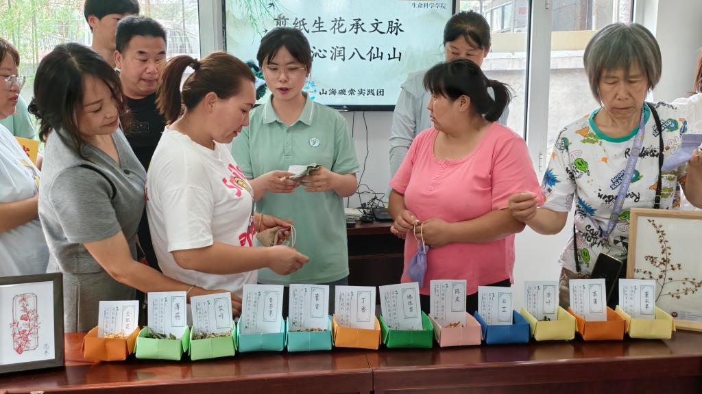 實踐團與古強峪村黨支部深度合作,舉辦“剪紙生花承文脈 藥香沁潤八仙山”生態文化體驗活動,邀請當地村民共話生態保護與發展。團隊成員系統展示了在八仙山采集制作的生態標本和創意剪紙圖譜,通過圖文并茂的方式詳細解讀當地豐富的生態資源和文化底蘊。活動現場特別設置了中藥香囊制作體驗區,村民們親手參與制作蘊含道地藥材的香囊,在互動體驗中深入了解家鄉資源價值。這種將文化傳承、生態保護與產業培育有機結合的創新模式,正在當地逐步形成“以文促保、以保帶產、以產興村”的可持續發展新路徑,為鄉村振興注入新動能。