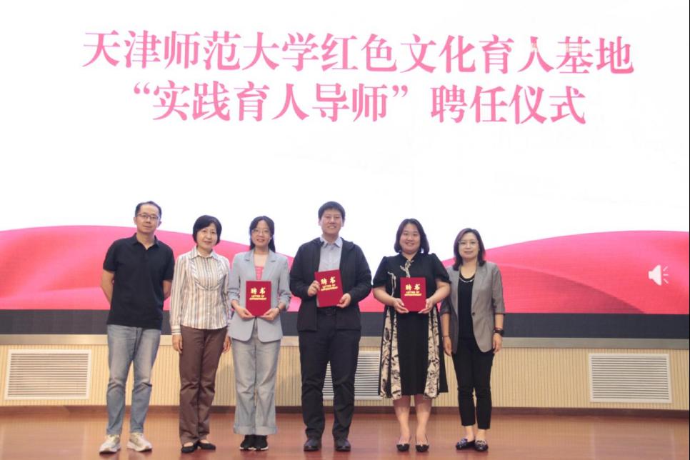 在天津師范大學紅色文化育人基地“實踐育人導師”聘任儀式上,天津市李叔同故居紀念館館長張堃,天津市勸業場街道花園路社區黨委書記、居委會主任陳蕾,天津市紀委監委駐天津工業大學紀檢監察組紀檢監察員白卓讓受聘為“實踐育人導師”。