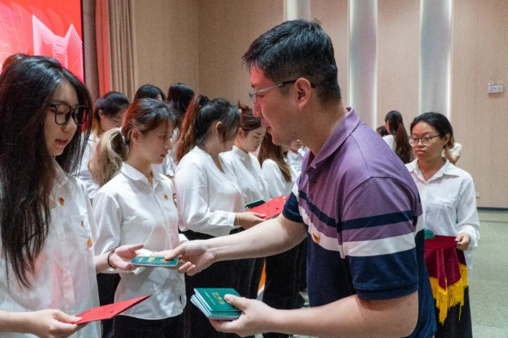 出席儀式的領(lǐng)導(dǎo)老師為新黨員佩戴黨員徽章,并發(fā)放政治生日卡、黨章;為新團(tuán)員佩戴團(tuán)徽,并發(fā)放團(tuán)員證和團(tuán)員生日卡。