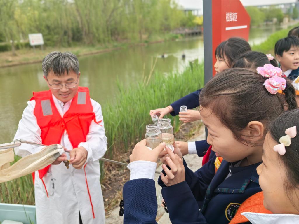 三組同學們來到師大鑰匙湖畔進行水質檢測實踐。楊曦老師帶著同學們用儀器分別檢測了湖中水、礦泉水、純凈水的酸堿性(pH值)、溶解氧(DO)、總溶解固體物質(TDS)等,一個個數據讓同學們對日常生活中的水有了更深入地了解。郭長城老師利用浮游生物采集網,通過“S”形采集1-3分鐘浮游動物,裝入事先準備好的透明樣品瓶中,供同學們現場即時觀察采集到的浮游動物。郭老師告知同學們水體是一個復雜的生態系統,良好的水質依靠健康的水生態系統維持,浮游動物是水生態系統的重要組成部分,在維持水體健康環境中具有不同尋常的作用。他以此教育同學們,保護生態環境是每個人神圣的職責,我們要從小就養成愛護環境、不亂丟垃圾的習慣,愛護人類賴以生存的水環境。