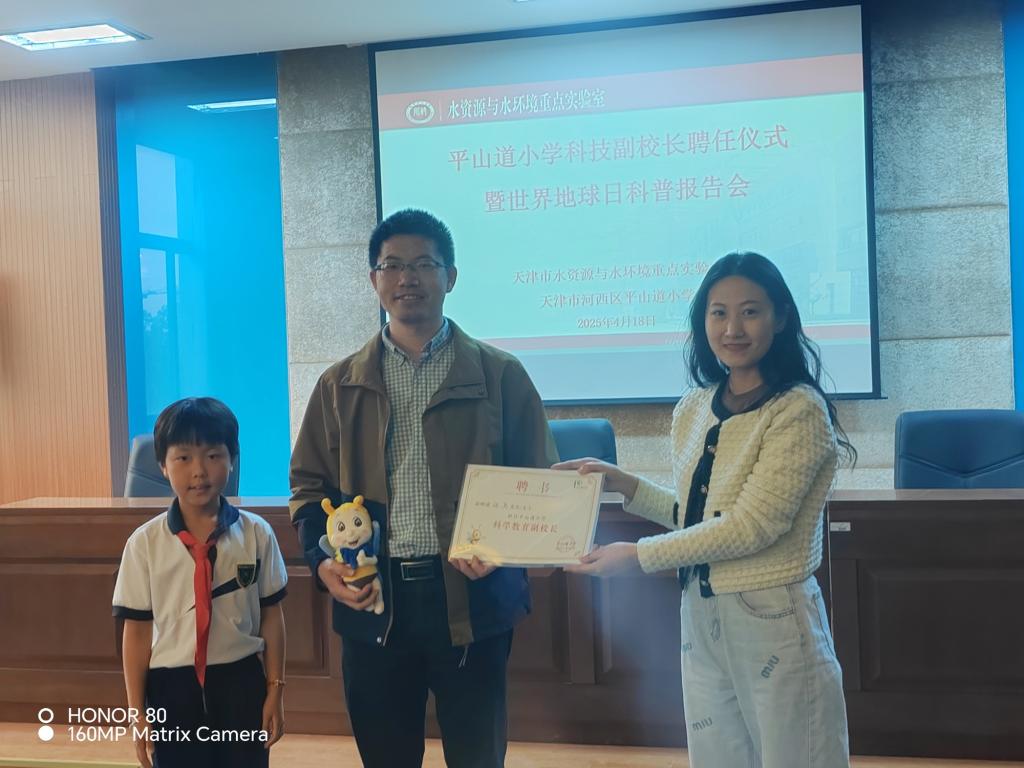 平山道小學德育主任張蕊老師為天津市水資源與水環境重點實驗室黨員張兵老師頒發了聘書,正式聘請他為該校科學教育副校長,標志著雙方在“科教融合”領域邁出新步伐。之后,張兵老師以《解密水循環 珍惜水資源 共筑水安全》為題,用生動有趣的方式深入淺出地講解了水循環、水利用等知識,同學們聽得津津有味,不時舉手提問,現場氣氛熱烈。張兵老師的報告內容豐富而精彩,不僅增長了同學們的知識,更激發了他們對科學探索的熱情,讓他們明白科學就在身邊,只要用心去發現,就能探索出無限的可能,強國使命在孩子們心中悄然扎根。