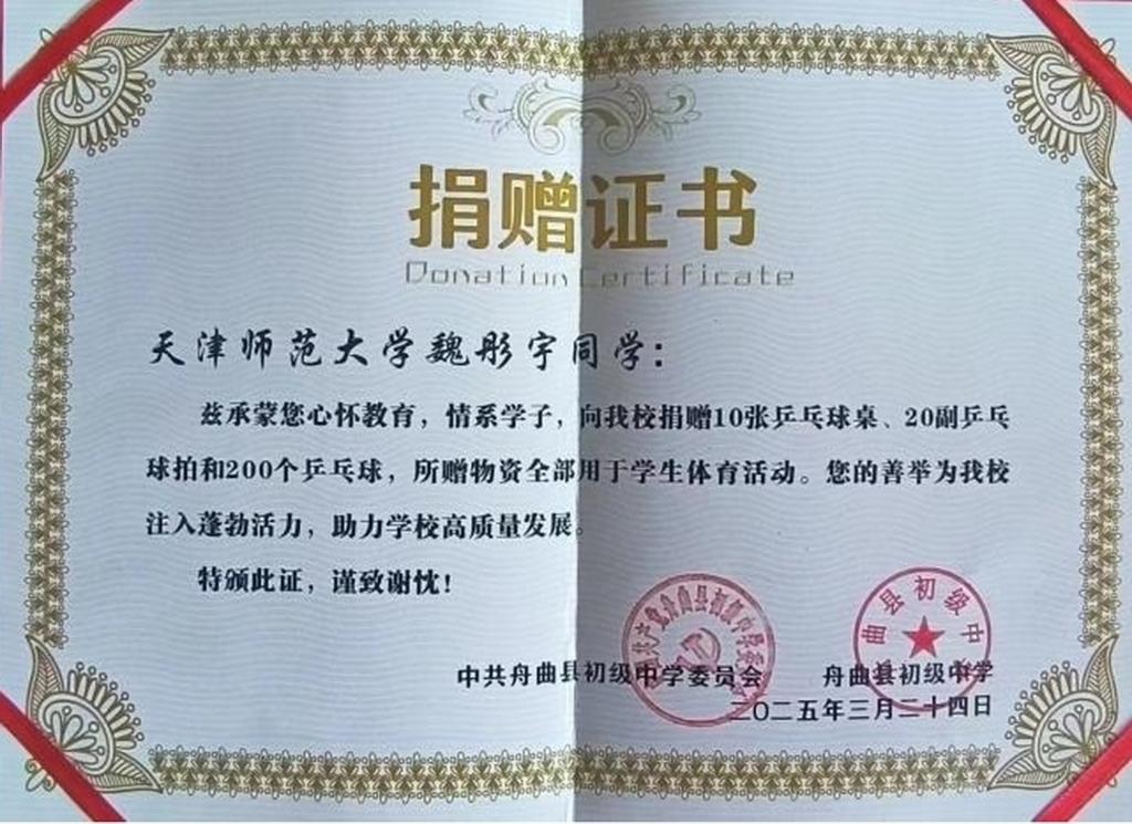 在家人支持下,魏彤宇決定將積攢的實習(xí)收入用于購置體育用品捐獻(xiàn)給甘肅省甘南州舟曲縣初級中學(xué),10張嶄新的乒乓球臺、20副乒乓球拍、200個乒乓球于2025年3月悉數(shù)到達(dá)舟曲初中,為該校體育教育注入新的活力。這一善舉并非一時興起,而是源于魏彤宇自加入中國青年志愿者協(xié)會以來多次參與志愿活動得到一些體會:體育不僅是強健體魄的載體,更是錘煉意志的熔爐;教育幫扶需要的不僅是物資,更需長久的關(guān)注與溫度。一張球臺,或許能為山區(qū)少年推開一扇眺望世界的窗;一次行動,亦能傳遞教育公平的薪火——師范學(xué)子不僅是知識的接受者,更應(yīng)成為進(jìn)一步促進(jìn)實現(xiàn)教育公平的踐行者、教育溫度的傳遞者。