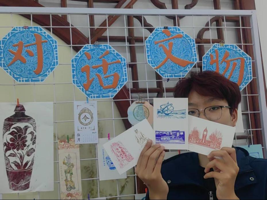 完成線裝書(shū)縫制后,研學(xué)活動(dòng)轉(zhuǎn)入文物集章打卡區(qū)。這里陳列著回墨、滾輪、套色等不同形制的各色印章,既有“宣德?tīng)t”“錯(cuò)金刀”“博山爐”等文物復(fù)刻圖案,又有“興文樓”“時(shí)間廣場(chǎng)”“鋼筆尖”等校園地標(biāo)元素。參與者手持自制線裝本,穿梭于印章桌臺(tái)間,在蓋章互動(dòng)中與印刷、篆刻與傳拓技藝親切對(duì)話,收獲了承載師大記憶的文物書(shū)簽與明信片。