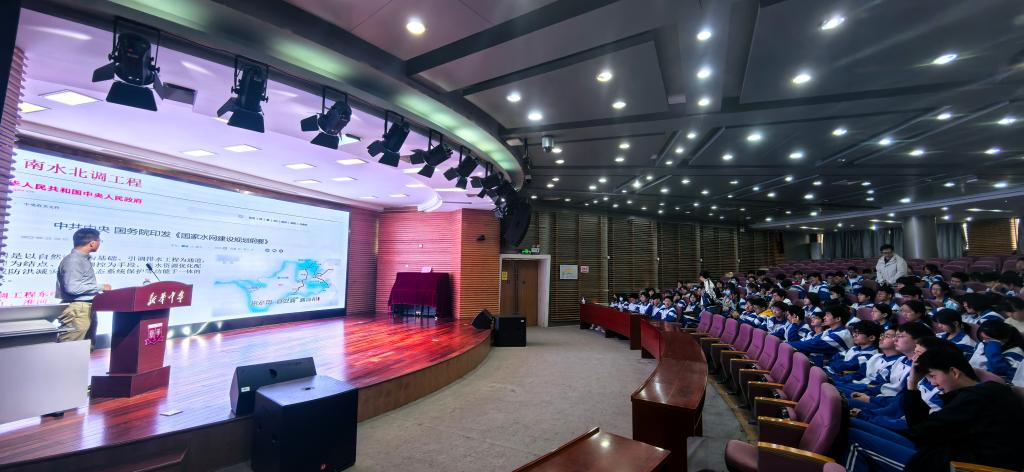 張兵老師以《解密水循環(huán)珍惜水資源共筑水安全》為題,為新華中學(xué)師生帶來一場深入淺出的科普講座。他從地球系統(tǒng)科學(xué)切入,以同位素示蹤技術(shù)解密水的“前世今生”;通過全球淡水分布數(shù)據(jù),揭示我國水資源“總量多、人均少、分布不均”的嚴(yán)峻現(xiàn)實(shí);更以天津?yàn)槔宫F(xiàn)南水北調(diào)工程如何讓一座“干渴之城”蛻變?yōu)椤昂雍?fù)蘇、候鳥云集”的生態(tài)典范。從“水往高處流”的東線工程奇跡,到白洋淀“荷塘葦海”的生態(tài)重生,再到天津河湖水面十年增加131平方公里的治理成效……科學(xué)與情懷交織,讓抽象的“水安全”化為可觸可感的家國成就。講臺(tái)下,學(xué)生們認(rèn)真做著這份特殊的思政筆記:“每一滴水,都是中國智慧的結(jié)晶。”