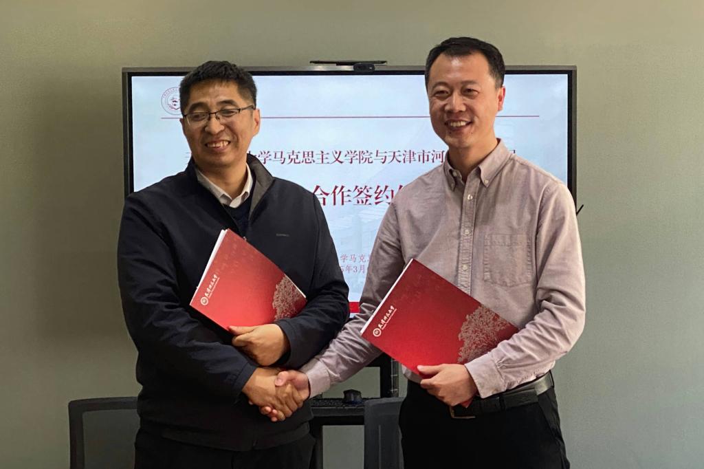 本站訊(通訊員 金明昊)日前,天津市河北區教育局、教師發展中心負責同志一行蒞臨馬克思主義學院,開展共建簽約活動。河北區教育局副局長張海波、學管科科長楊芳、教師發展中心主任段崇偉、副主任何潔,大思政工作室主持人以及育嬰里小學等部分中小學負責同志、教師代表,與馬克思主義學院黨委書記郭尚維,常務副院長李朝陽,院黨委副書記、紀委書記張素玲,副院長王雪超及各教研室主任、教師代表共計30余人參加。簽約儀式由馬克思主義學院黨委書記郭尚維主持。
