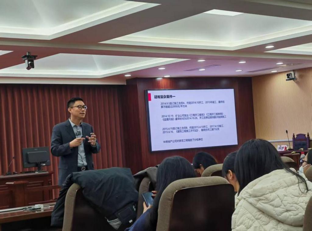 在講座中,盧光榮律師為學生解讀了律師代理復雜疑難案件中道與術的關系。他指出,作為一名律師,在處理案件過程中既要重“道”,堅守做事的指導原則,又要重“術”,注意做事的具體方式、技巧和方法,要做到道與術的統(tǒng)一。隨后,他為各位同學分享了自己親自辦理的有關施工合同、設備采購合同、借款合同等領域的五個典型案例,并結合案例為同學們梳理和解析了每一個案件處理過程中的關鍵問題和爭議焦點,并為同學們講解了處理案件的過程中如何認定事實、適用法律,分享了自己在辦案中的經驗。作為校友,他勉勵學院學生要堅守職業(yè)底線,作為法律人要“養(yǎng)一身正氣,蓄滿腔熱血,破歪魔邪道”,要有推動社會進步的勇氣和責任感,要自覺以事實為依據、以法律為準繩,學會在“法律中的現(xiàn)實”與“現(xiàn)實中的法律”尋找最佳切合點,在最大程度上實現(xiàn)當事人利益的最大化。