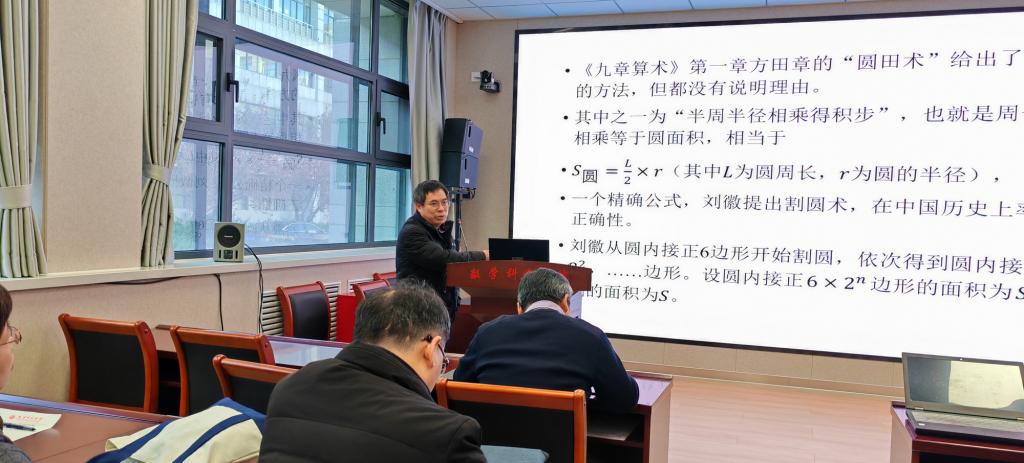 在講座中,鄒大海研究員介紹了魏晉時期我國偉大數學家劉徽的生平事跡和數學成就,如劉徽率的理論、割圓術、重差術、劉徽原理、牟合方蓋等,這些成就不僅包括分數四則運算法則、比例算法、面積和體積算法等基礎數學知識,還涉及了線性方程組、一元二次方程求根等高級數學內容。鄒大海表示,劉徽的思想方法具有強烈的證明意識,他尊重經典但不盲從,通過嚴謹的邏輯推理和創新性的轉化,將哲學概念轉化為科學概念;所設計的牟合方蓋等幾何模型,體現了強烈的設計思想和實事求是的科學態度,這些都值得后人繼承和發展。鄒大海指出,去年11月召開的第四十二屆聯合國教科文組織大會上,劉徽誕辰周年系列紀念活動獲得審議并通過,這表明劉徽已經得到全世界的關注和贊譽。