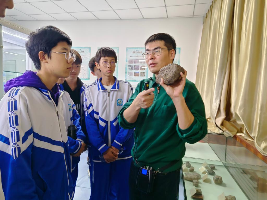 在地質標本展室,同學們在王海濤老師的帶領下,探索了巖石礦物和古生物化石的奧秘,感受到地質變遷的魅力,探尋傾聽了遠古生命的訴說,逐步學會了如何用發展的眼光看待外部環境變化。