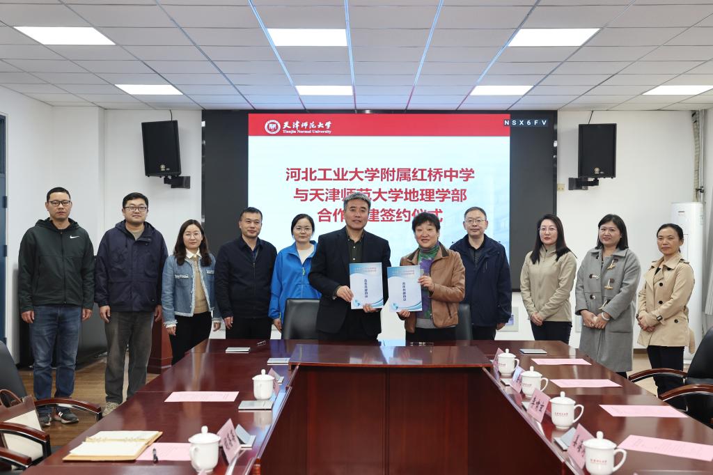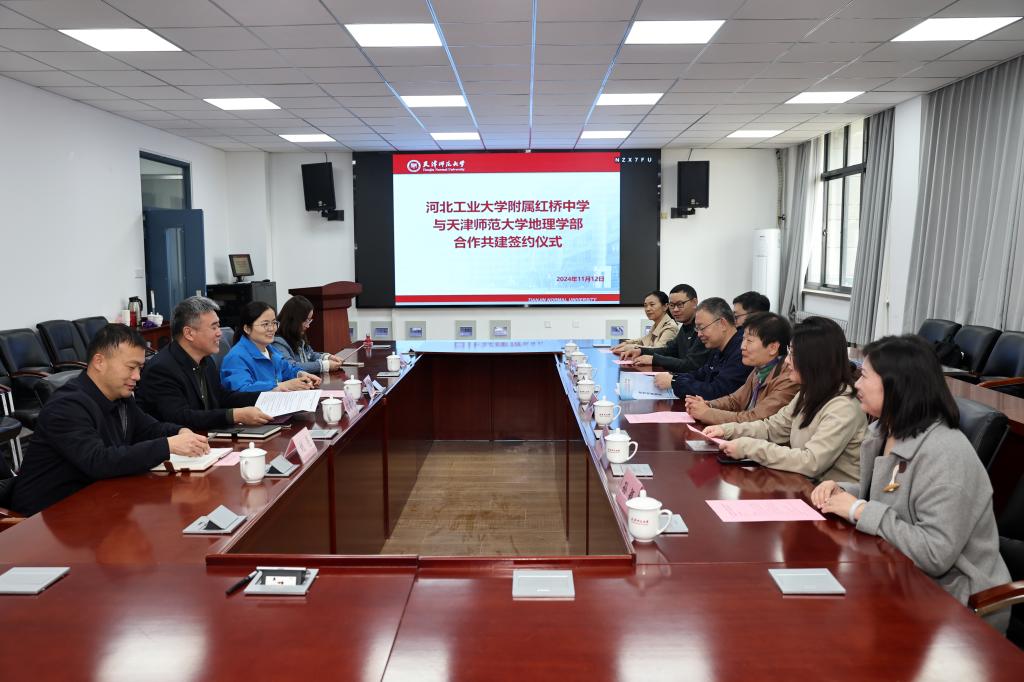 本站訊 (通訊員 劉琳)2024年11月12日,天津師范大學地理學部與河北工業大學附屬紅橋中學合作共建簽約儀式在天津師范大學地理學部舉行。河北工業大學附屬紅橋中學黨委書記孫鴻毅、校長姜海濤帶領師生150余人來我校參加共建活動。地理學部黨委書記蘇睿先、副書記劉亮、教學副院長胡蓓蓓、地理科學系副主任趙美風等教師代表參加簽約儀式。