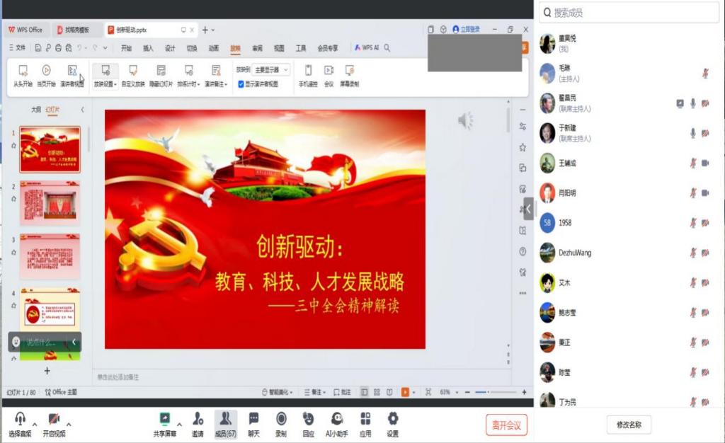 本站訊(通訊員 董昊悅)為深入學習貫徹黨的二十屆三中全會精神,引導廣大老干部切實把思想和行動統一到黨中央的決策部署上來,近日,黨委離退休工作部舉行專題報告會,邀請我校關工委報告團成員、政治與行政學院翟昌民教授以“創新驅動:教育、科技、人才發展戰略——黨的二十屆三中全會精神解讀”為主題帶領大家進行集體學習。我校離退休老干部、關工委成員、離退休教職工黨支部書記、部分離退休黨員和黨委離退休工作部全體在職干部共70余人線上參加集體學習。會議由校關工委常務副主任于新建主持。