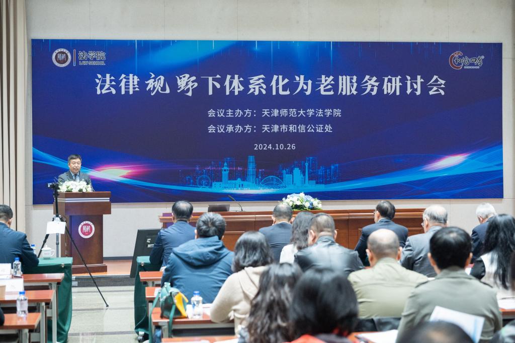 本站訊(通訊員 侯慧秀)10月26日,由我校法學(xué)院主辦,天津市和信公證處承辦的“法律視野下體系化為老服務(wù)研討會”在學(xué)校會議中心舉行。天津市僑聯(lián)黨組成員、副主席楊昆、陳敬,天津市公證行業(yè)黨工委副書記、天津市公證協(xié)會會長單彬,我校黨委常委、統(tǒng)戰(zhàn)部部長張向東,天津市公證行業(yè)黨工委副書記、天津市司法局公共法律服務(wù)二處處長吳香湘,天津市民政局老齡處處長趙治國,天津市僑聯(lián)秘書長、經(jīng)濟(jì)科技保障部部長李衛(wèi)新,天津市河西區(qū)司法局黨委書記、局長趙金力,天津市河?xùn)|區(qū)人民法院黨組成員、副院長錢天彤,我校法學(xué)院院長郝磊,天津市僑聯(lián)法律顧問委員會主任王世清以及來自實務(wù)界的嘉賓150余人參加會議。會議由法學(xué)院副院長郭明龍教授主持。
