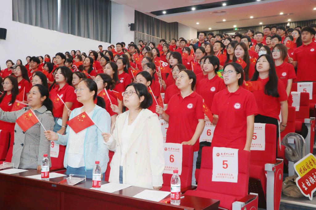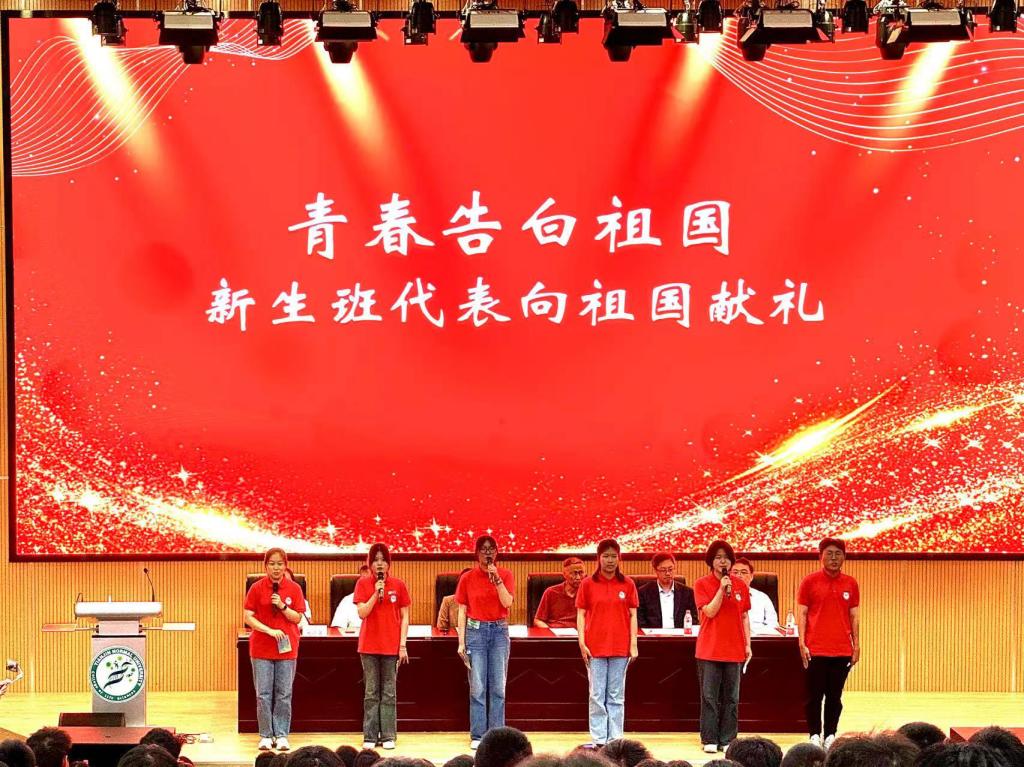 六位新生上臺深情告白祖國,為祖國母親送上最誠摯的祝福。學院團委書記單一鳴帶領全體新生進行宣誓,誓詞鏗鏘有力,展現了全體新生自信自強、剛健有為的精神風貌。
