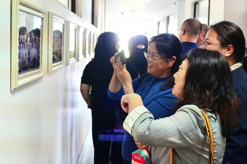 班會后,校友們饒有興致地參觀了天津市科普基地——科學體驗館、“繁星筑夢”天津師范大學首屆科學家精神展和“循跡啟航”天津師范大學物理科普成果展。與正在開展研學的中小學生親切交流,在學院歷屆畢業生合影長廊追尋記憶,在明理樓前廣場的校友畢業30年返?;顒又黝}背景墻前合影留念。