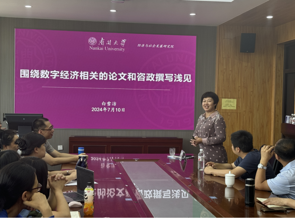 白雪潔從跨學科性、數字經濟的規模與增長、數字經濟下的產業升級、數字經濟下的就業和收入分配等多個方面對相關論文和咨政報告的主題選取和撰寫進行了深入淺出的分析。白雪潔強調了宏觀視野的產業結構演進在數字經濟研究框架下的重要意義;講解了數字經濟影響產業結構升級的“出新”與“煥新”機制以及高質量服務化等系列問題的深入思考。在交流環節,白雪潔與經濟學院教師展開了互動探討,分享了對數字經濟發展及相關應用問題的獨到見解。講座既有宏觀戰略視野,也著眼于現實經濟問題,令與會教師受益匪淺。