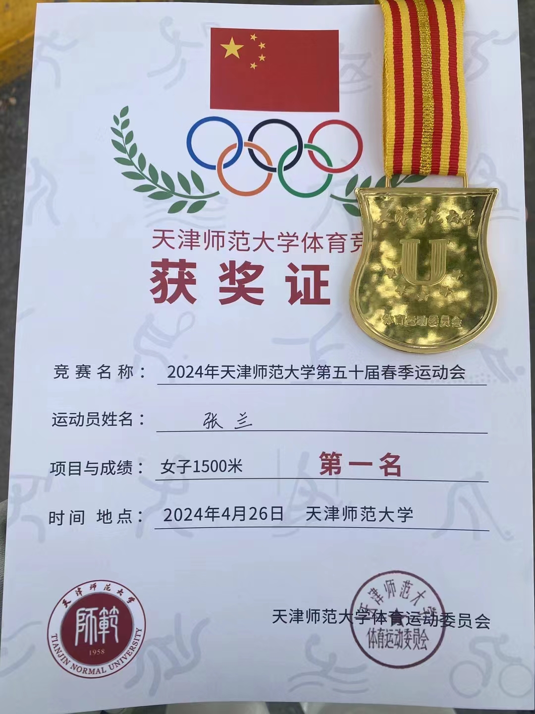 這位來自“天府之國”的“川妹子”,很早之前便與“跑步”結緣,在日復一日、年復一年的訓練、比賽中,她逐漸地找到了青春的新方向。張蘭所讀專業在平日里學習任務重、課堂要求高,但她用熱愛和堅持找到了兩者間的平衡,在不耽誤學業的前提下,積極參與校內外競賽項目,多次參加天津市田徑比賽等賽項,在賽場上與優秀選手一同交流,總結經驗,反復訓練,不斷取得突破。2023年她如愿獲得了第十三屆校園馬拉松女子組冠軍,此前,她代表學校參加了中華人民共和國第一屆學生(青年)運動會,雖然沒有拿到名次,但在5000米和10000米項目中達到了二級運動員水平,順利獲得了國家二級運動員證書。對張蘭來說,從0到1的突破是激勵她繼續向前奔跑的最好動力。