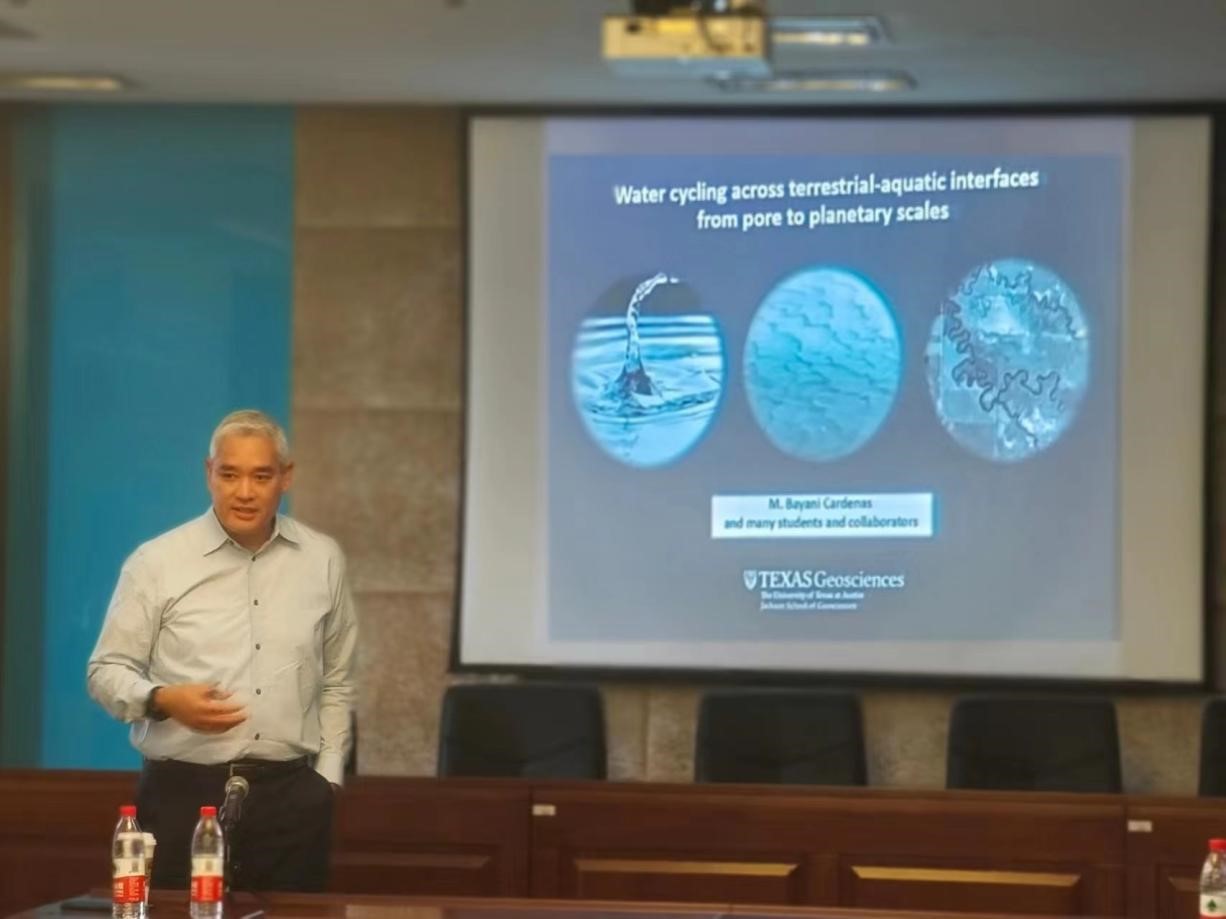 M. Bayani Cardenas教授以《Water cycling across terrestrial-aquatic interfaces from pore to planetary scales》為題作了報告,介紹了不同尺度上河流-潛流帶-含水層中物理與化學(xué)過程以及跨尺度模擬,特別是不同尺度下(自孔隙尺度到大陸尺度)水循環(huán)過程機(jī)制,地表水-地下水相互作用,及其對流域水質(zhì)和近海水環(huán)境的影響。