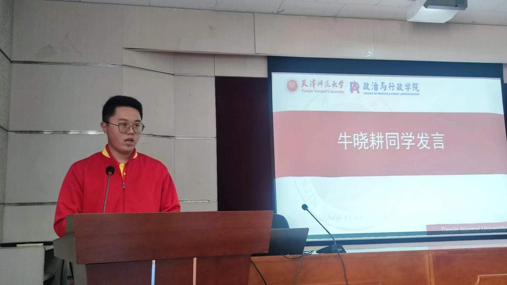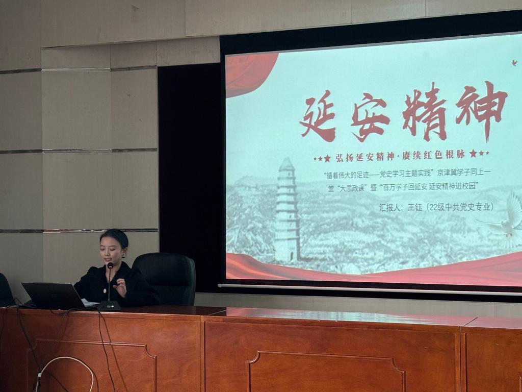 王鈺用一幅幅圖片向大家詳細介紹了本次研學活動,與在座師生共同感受毛主席等老一輩革命家在延安住窯洞、吃粗糧、穿布衣,艱苦奮斗、自救自強,用“延安作風”打敗了“西安作風”的光榮歷史。共同學習習近平總書記在梁家河為老百姓建沼氣池、買磨面機,為民造福、追求真理、埋頭苦干的精神。牛曉耕分享了他參加研學團的學思感悟,表示參加研學團既是一種榮譽也是一種激勵,作為一名高校學生應當挖掘延安精神蘊含的內涵價值,在科研探索、理論研究中堅持自力更生、艱苦奮斗,在將小我融入大我、青春投身基層的偉大實踐中全心全意為人民服務。
