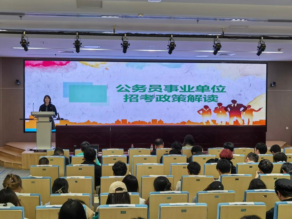 在就業政策宣講會上,河東區人力資源和社會保障局副局長尚琳、河東區公共就業(人才)服務中心部長孫軼愷、中天人力中天人力畢業生服務部陶紅輝、河東區公共就業(人才)服務中心副部長蔡玉欣分別就公務員事業單位招考和崗位選擇、高校畢業生就業見習、畢業生檔案、畢業生創業扶持等內容進行解讀。來自數學科學學院、新聞傳播學院、文學院的在校生共計200余人聆聽宣講會。