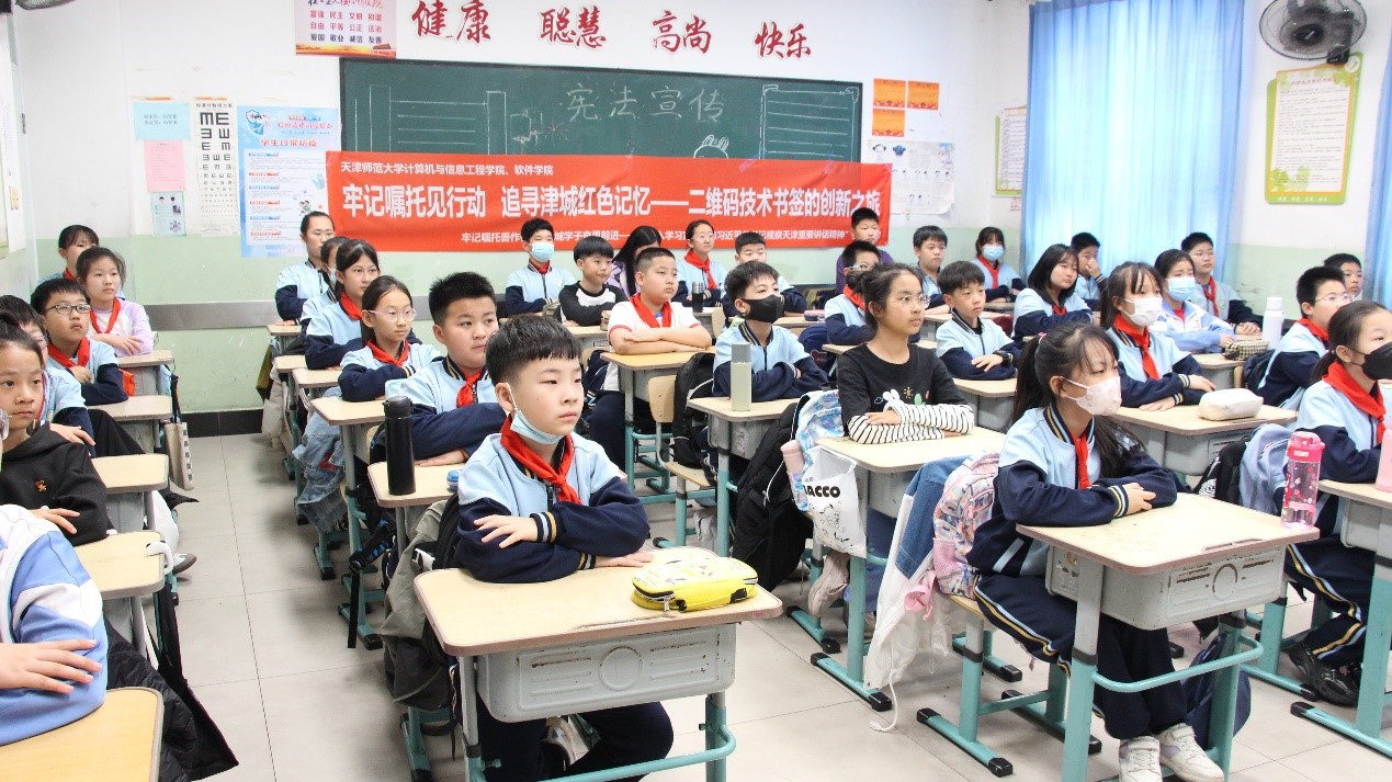 在“牢記囑托見行動 追尋津城紅色記憶——二維碼技術書簽的創新之旅”科普思政實踐課程中,實踐團成員帶領學生們以天津各大紅色紀念館為主題,通過手繪和拼貼的方式,制作帶有紅色革命紀念館介紹二維碼的書簽。實踐團成員掃描二維碼,將各大紅色革命紀念館中革命先輩的偉大事跡呈現給學生們,在使學生們領略奇妙的二維碼技術的同時傳承紅色基因,賡續精神血脈。
