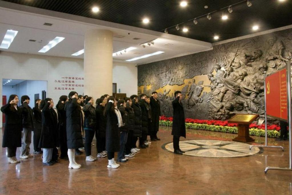 學院師生代表跟隨講解員參觀了烈士陵園建國后紀念館和革命烈士紀念館。珍貴的圖片和實物史料、烈士的感人故事,讓大家重溫先輩浴血奮斗的偉大精神。新聞傳播學院2023年新一批入黨和入團學生代表在紀念館浮雕墻前進行宣誓。