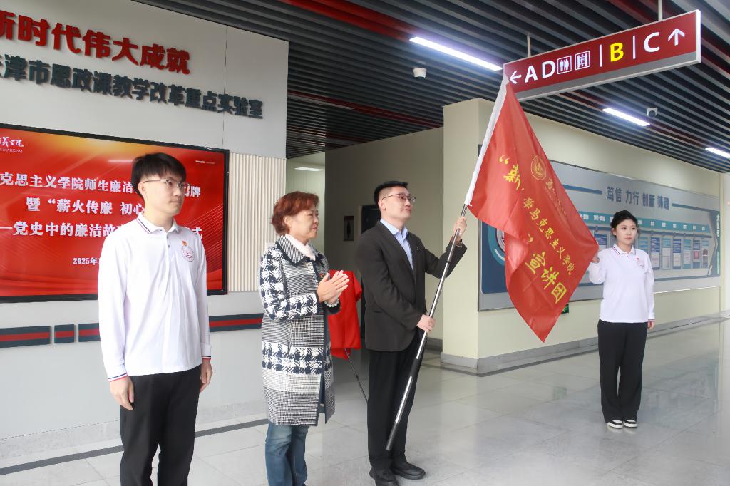 黨委教師工作部(教師發展中心)部長(主任)劉紅英為馬克思主義學院廉潔教育師生宣講團授旗。市紀委監委駐校紀檢監察組副組長蘇文鵬為馬克思主義學院廉潔教育基地揭牌。