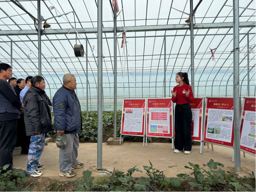 沿著鄉間小路前行,師生們走進精品蔬菜園。馬克思主義學院副院長王雪超結合眼前景象講解道:“實現農業現代化,我們第六埠村不僅要繼續夯實‘藏糧于地’的基礎,建設好高標準農田;更要激發‘藏糧于技’的動能,用科技為農業插上翅膀,讓優質農產品產出更高效益,這深刻體現了新發展理念在鄉村振興中的實踐要求。”學生理論宣講團成員劉梓晗同學則以“一粒米”的全產業鏈故事為例,描繪了農產品從種植到加工、銷售的增值路徑。“咱村的蔬菜品質好,只要打響品牌、延伸鏈條,就能賣上好價錢,這就是高質量發展的門道。”田間勞作的村民指著長勢良好的蘿卜,對“科技農業”有了更清晰的憧憬。
