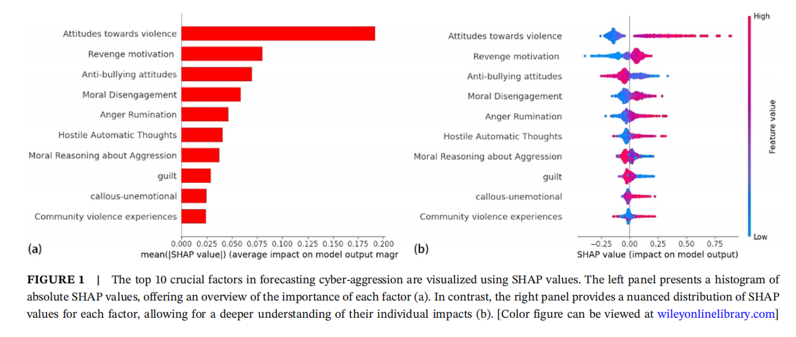 由教育部人文社會科學重點研究基地天津師范大學心理與行為研究院、天津師范大學心理學部朱文鳳副教授、碩士生王凱撰寫的論文“Dissecting the Predictors of Cyber‐Aggression Through an Explainable Machine Learning Model”于2025年1月在Aggressive Behavior發表,該文由朱文鳳和田雪教師擔任共同通訊。該研究得到國家自然科學基金(32000768)的資助支持。