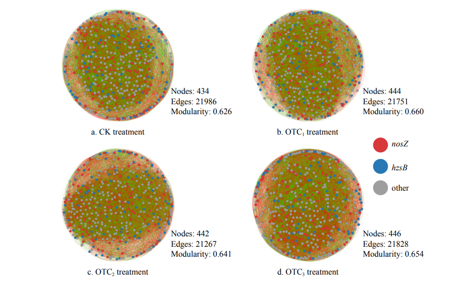 河岸緩沖帶在陸地與水生生態系統之間形成一道屏障,通過一系列水文、物理、化學和生物過程攔截污染物。因此,探索河岸緩沖帶中活性氮的去除途徑以保護河流尤為重要。微生物反硝化作用和厭氧氨氧化是河岸帶去除硝酸鹽的兩個關鍵生物過程。然而,鄰近養殖場抗生素輸入對這兩個過程的影響機制尚未完全明確。本研究通過泥漿體系15N同位素示蹤技術結合微生物網絡分析,探究了土霉素(OTC)短期暴露對河岸帶微生物反硝化和厭氧氨氧化過程的影響。研究發現:短期OTC暴露會通過抑制相關功能基因顯著降低反硝化和厭氧氨氧化效能,但在高濃度OTC條件下將出現抑制上限現象;優勢菌群未發生顯著改變,但微生物網絡通過增加復雜度維持系統穩定性;攜帶nosZ和hzsB基因的功能菌群呈現抑制效應、促進效應和無顯著效應等差異化響應特征。結果表明,短期OTC暴露未能全面影響所有功能菌群,使得相當比例的菌株仍保持脫氮性能。在nosZ基因攜帶菌中,22.2%為反硝化模式菌株,77.8%為非反硝化模式菌株,說明脫氮功能的恢復需要依賴多樣化菌群的協同作用。該研究為揭示含抗生素廢水對水生生態系統氮超負荷的影響提供了科學依據,同時表明需加強河岸帶及近海生態系統的抗生素污染管控。