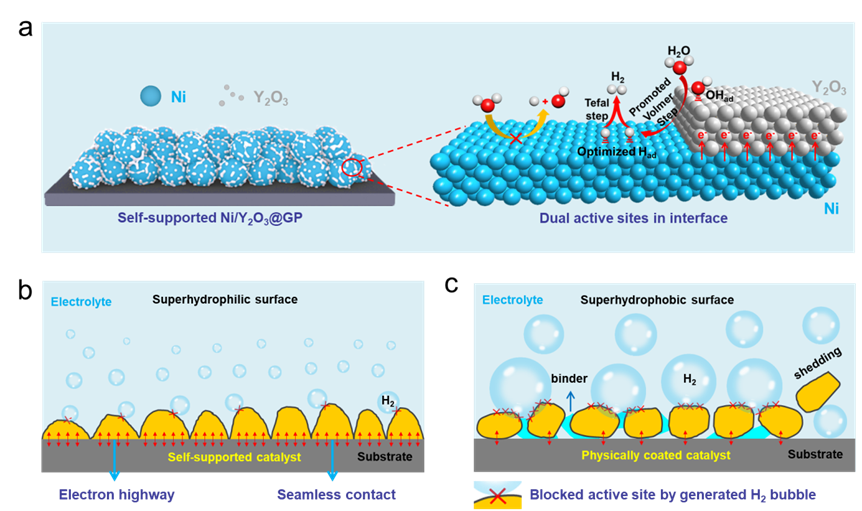 圖 電極的雙功能活性位點(diǎn)協(xié)同催化機(jī)理、自支撐電極結(jié)構(gòu)和超親水界面調(diào)控示意圖