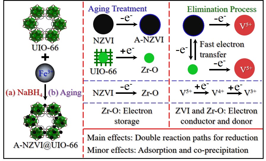 MOF負(fù)載納米鐵(NZVI@UIO-66)在克服團(tuán)聚問題、提高納米鐵(NZVI)去污效率方面具有顯著的應(yīng)用前景。本研究合成一種納米鐵復(fù)合物NZVI@UIO-66具有很強(qiáng)的抗氧化性和高效除污性能。經(jīng)過老化處理,在較寬的pH范圍和濃度范圍,A-NZVI@UIO-66都可以高效的去除水中V5+,吸附能力達(dá)到了397.23mgV/g NZVI。且經(jīng)過酸洗處理,該復(fù)合材料具有很好的可重復(fù)利用性。需要注意的是硝酸鹽有競(jìng)爭(zhēng)抑制作用,所以在實(shí)際應(yīng)用中需要考慮硝酸鹽的影響作用才能達(dá)到更好的去除效果。A-NZVI@UIO-66具有獨(dú)特的Zr-O鍵,它作為電子供體可以通過電子傳遞介導(dǎo)氧化、還原雙反應(yīng)的進(jìn)行。故A-NZVI@UIO-66去除V5+的微觀機(jī)理包括物理吸附、還原反應(yīng)及絡(luò)合共沉淀的過程。本研究提出的這種實(shí)用型水體重金屬釩污染處理技術(shù),可以有效處理工業(yè)廢水,具有十分重要的理論意義和現(xiàn)實(shí)意義。